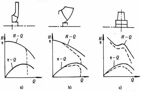 對于中高比轉速,流道短而寬,因而氣泡從發生發展到充滿整個流道需要一個過渡過程,相應的性能曲線開始是緩慢下降,之后增加到某一流量時才急劇下降。