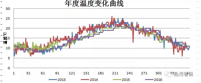 體系建設的基礎是溫度。溫度的數據統計需要進行以年為周期的長期性氣溫和生物池內的水溫監測,通過積累一年以上環境溫度的變化數據,才能具備體系整體建設的基本條件,通過溫度曲線的繪制,結合季節的更替變化,基本能夠確定出廠內微生物周期性的環境溫度的變化情況。系統化的季節調控體系建設通過收集污水廠的基礎運行資料完成基礎調控模型和調控依據。