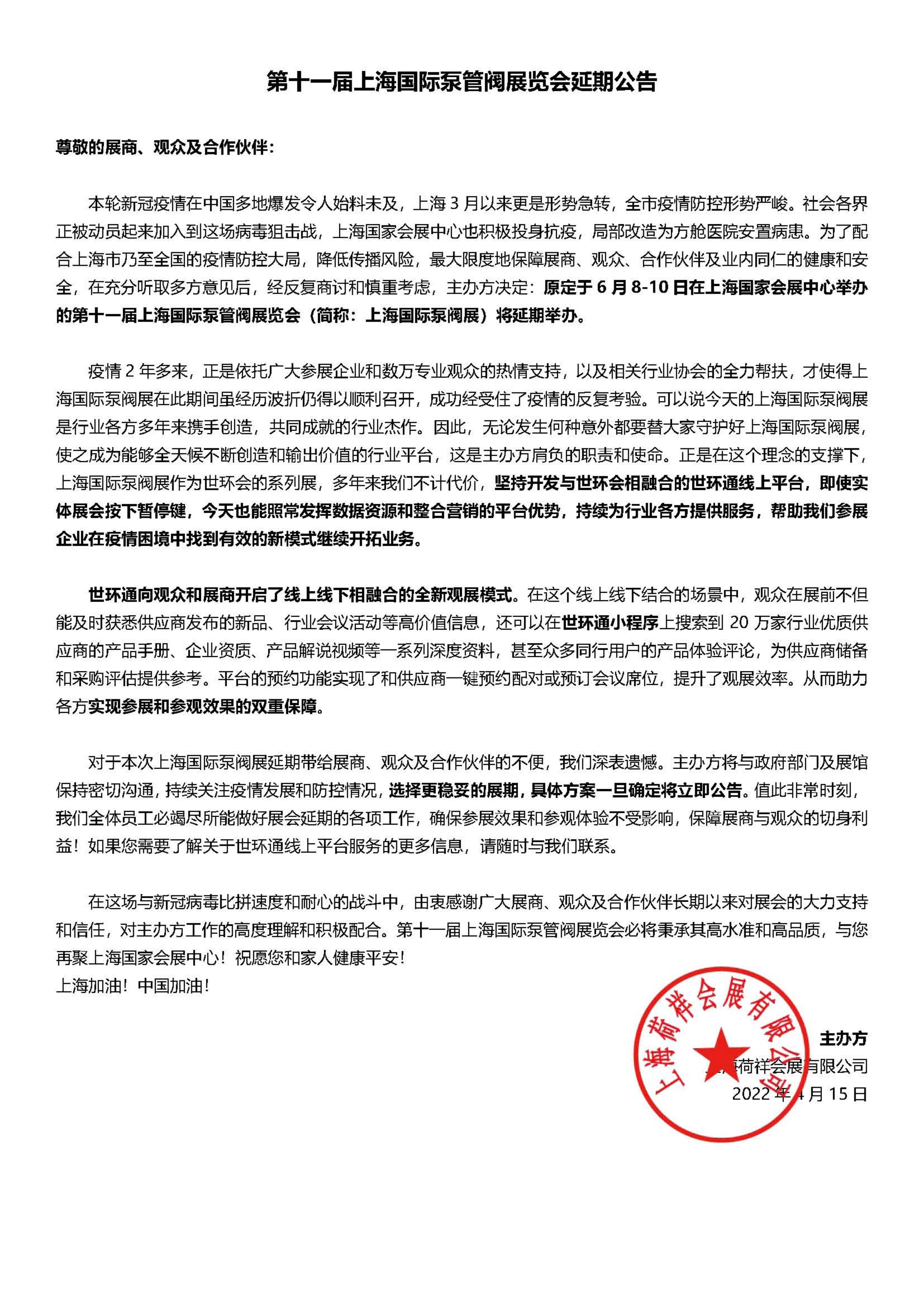 本輪新冠疫情在中國多地爆發令人始料未及,上海3月以來更是形勢急轉,全市疫情防控形勢嚴峻。社會各界正被動員起來加入到這場病毒狙擊戰,上海國家會展中心也積極投身抗疫,局部改造為方艙醫院安置病患。為了配合上海市乃至全國的疫情防控大局,降低傳播風險,最大限度地保障展商、觀眾、合作伙伴及業內同仁的健康和安全,在充分聽取多方意見后,經反復商討和慎重考慮,主辦方決定:原定于6月8-10日在上海國家會展中心舉辦的第十一屆上海國際泵管閥展覽會(簡稱:上海國際泵閥展)將延期舉辦。